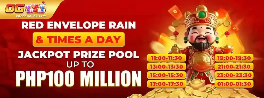 Huwag palampasin ang napakalaking premyo ng jackpot sa OG777 casino Philippines. Partikular, ang aming Red Envelope Rain ay nangyayari ng walong beses sa isang araw sa mga itinakdang oras. Dahil dito, ang pagiging aktibo ay nagbibigay sa iyo ng maraming pagkakataon na makibahagi sa ₱100 million na pondo. Bukod dito, mag-log in lamang sa mga oras ng kaganapan upang makilahok!